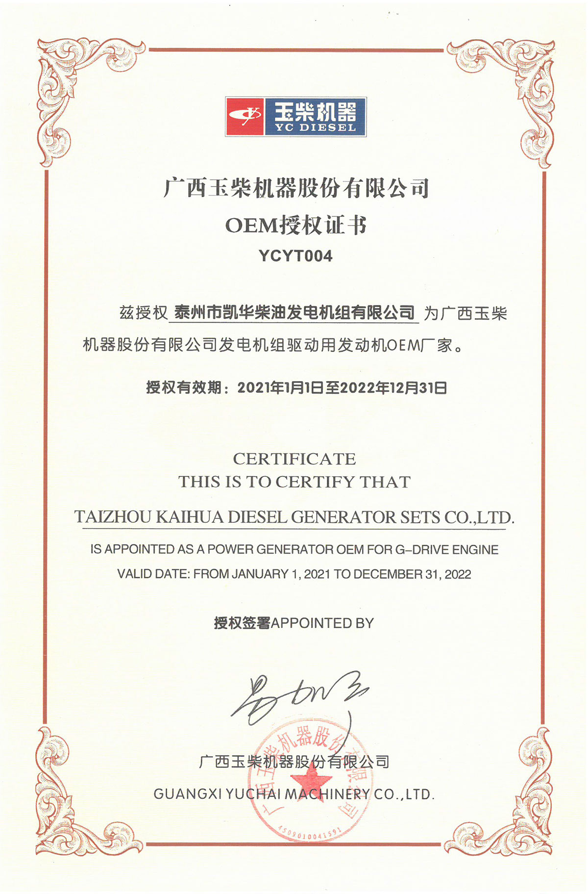 玉柴OEM證書